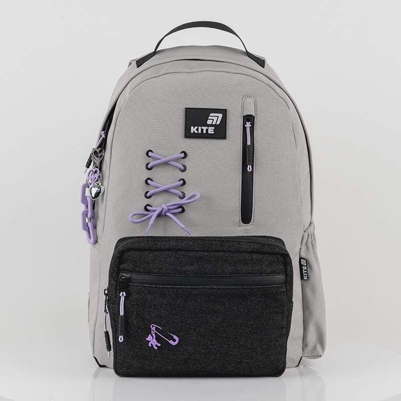 Minimalistyczna forma została wzbogacona o delikatne dekoracyjne sznurowanie, kieszeń z efektem faded jeans oraz stylowy brelok, tworząc modny, ale nienachalny design idealny do szkoły i na co dzień.