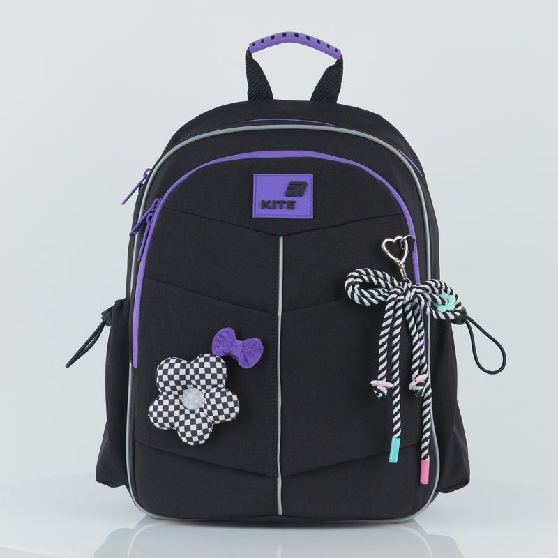 Plecak szkolny czarny dla dziewczynek 1 2 3 klasa ortopedyczny lekki z maskotką Kite K26-771S-2