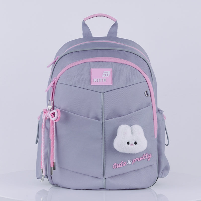 Plecak wyróżnia się wyjątkowo lekką konstrukcją, a jednocześnie zachowuje wysoką funkcjonalność. Główna komora na książki i zeszyty, wewnętrzne przegrody, pluszowa kieszeń na telefon oraz organizer z odpinanym uchwytem na klucze pomagają utrzymać porządek. Wzmocnione dno PU jest łatwe w czyszczeniu, a elementy odblaskowe z każdej strony zwiększają bezpieczeństwo dziecka po zmroku. Stylowy design z puszystą maskotką, haftem i brelokiem z paracordu sprawia, że plecak pięknie dopełnia szkolny look.