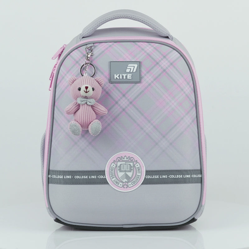 Tornister szkolny ortopedyczny dla dziewczynki 6 lat do 1 klasy z brelokiem zabawką misiek Kite K26-555S-1