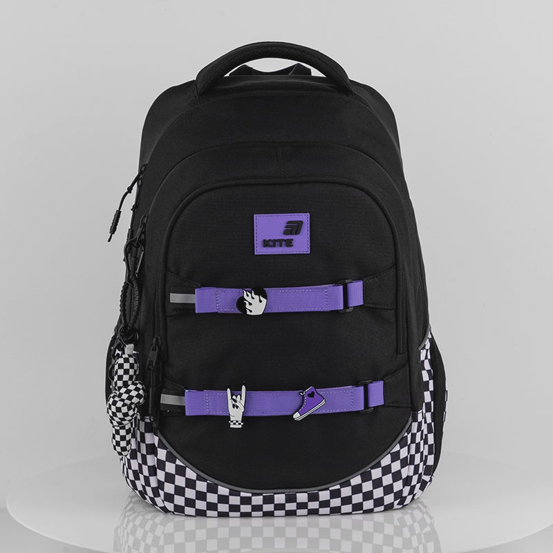Batoh školní mládežnický pro dívky 9-12 let systém AGS lehký batoh černý v kostce s úchytem na skateboard Kite K26-727L
